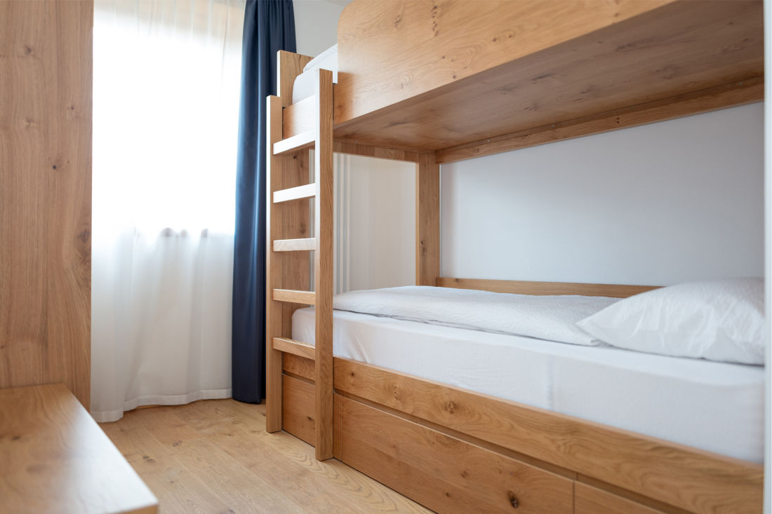 These bespoke apartments, perfect for those looking for intimacy, have areas up to 48 square metres. Two adjectives describe them perfectly: bright and carefully decorated. They have a double bedroom with large wardrobe, bathroom with shower and washing machine, and a living area with kitchen, built-in dishwasher, satellite TV, phone, and sofa bed. In our two-room apartments the light and landscapes of Alpe Cimbra always find a window to enter through, making every moment unforgettable.